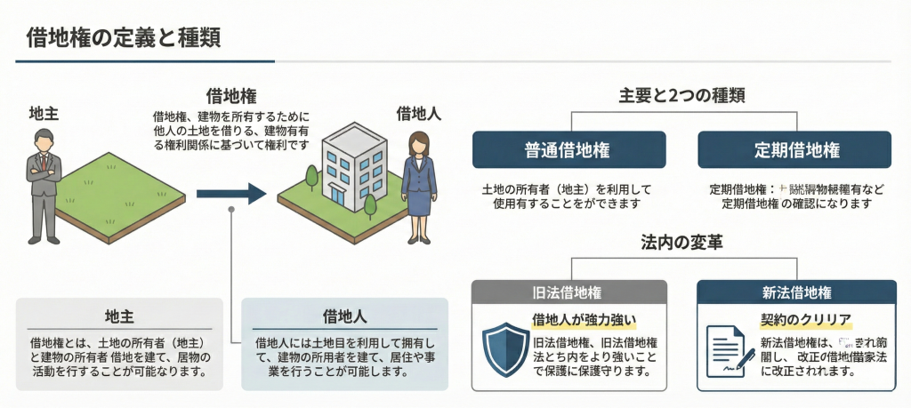 借地権とは、建物を所有するために他人の土地を借りる権利です。大きく分けて、普通借地権と定期借地権の2種類があります。借地権は、土地の所有者(地主)と建物の所有者(借地人)の間に成立する権利関係に基づいて発生します。借地権を設定することで、借地人は土地を利用して建物を建て、居住や事業活動を行うことが可能になります。土地を有効活用したい地主と、初期費用を抑えて土地を利用したい借地人のニーズを結びつける仕組みと言えるでしょう。 借地権には、さらに細かく分類すると、旧法借地権と新法借地権という区分も存在します。これは、借地借家法の改正によって、借地権に関する規定が大きく変更されたためです。旧法借地権は、借地借家法が改正される前に設定された借地権を指し、借地人の権利が手厚く保護されている傾向があります。一方、新法借地権は、改正後の借地借家法に基づいて設定された借地権であり、契約内容がより明確化されています。